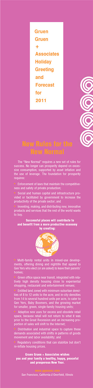 Since 1971, Gruen Gruen + Associates has published an annual holiday card forecast of important social, economic, and public policy issues and real estate investment and development opportunities. The annual forecasts for this decade are presented below.